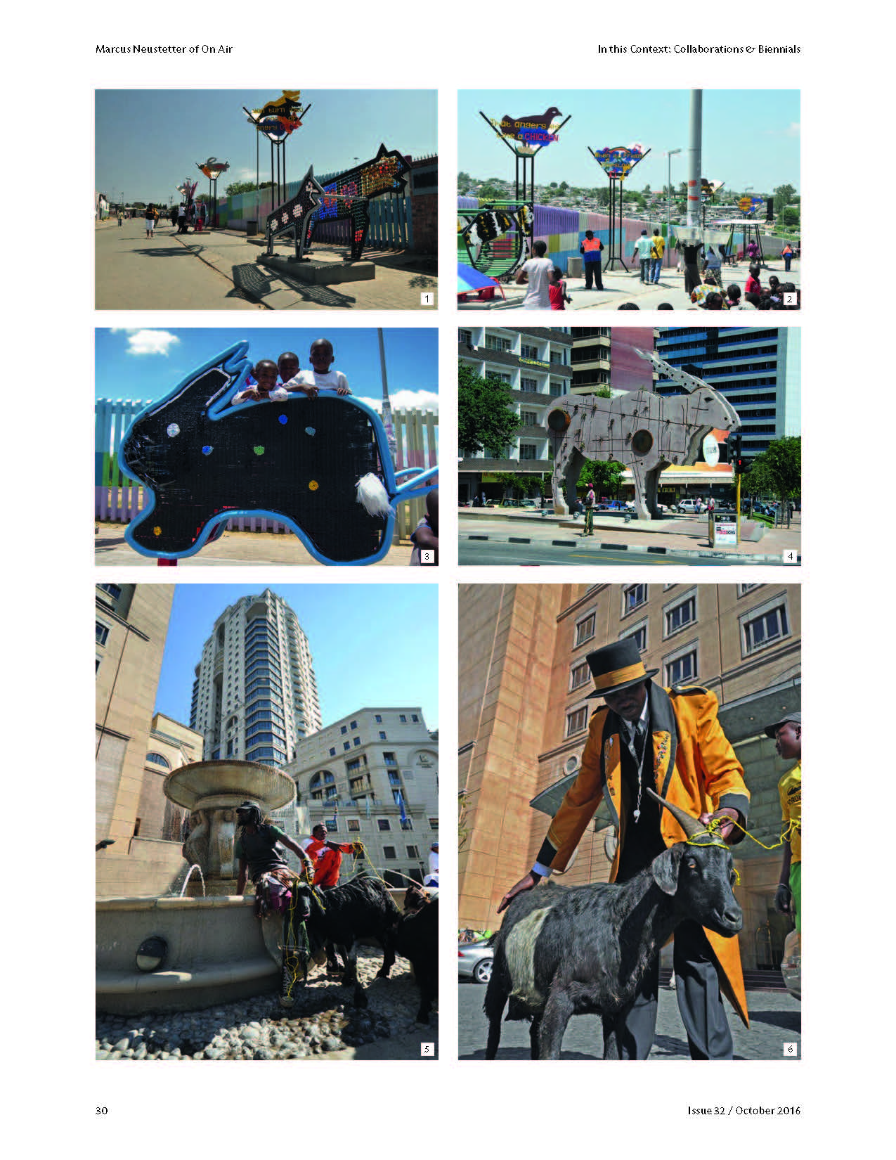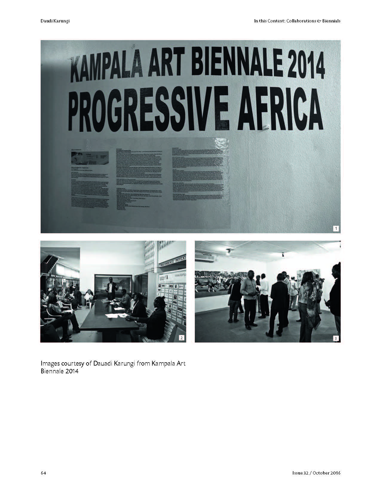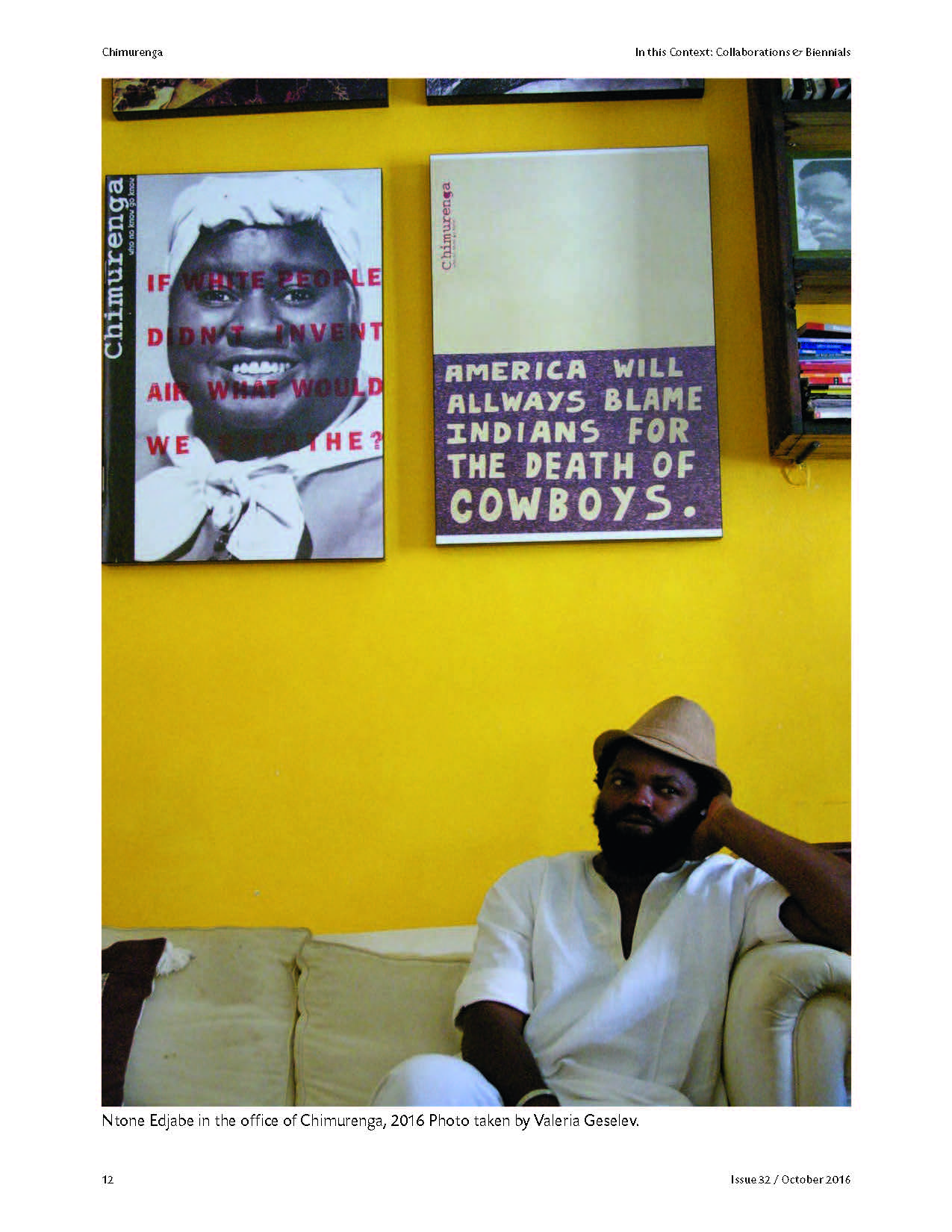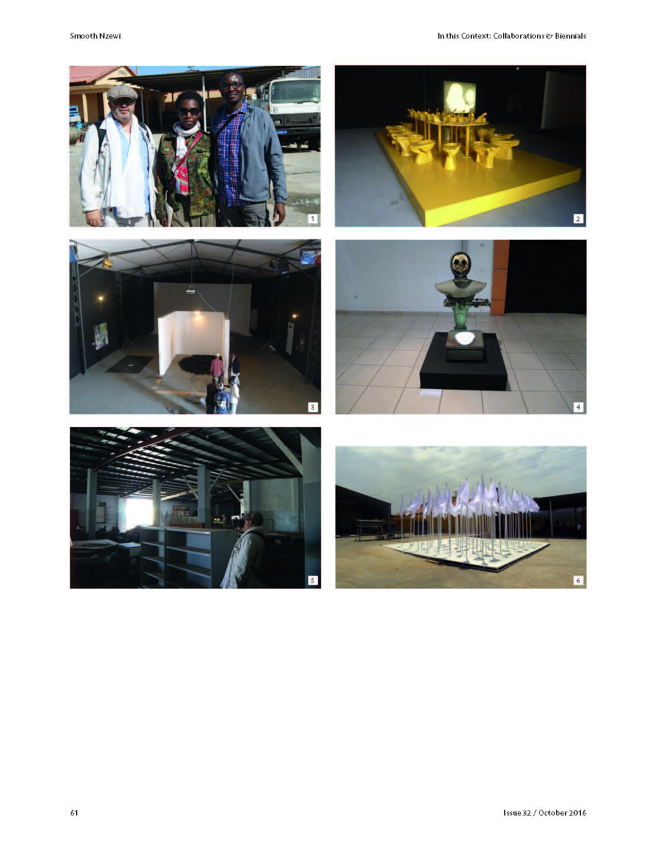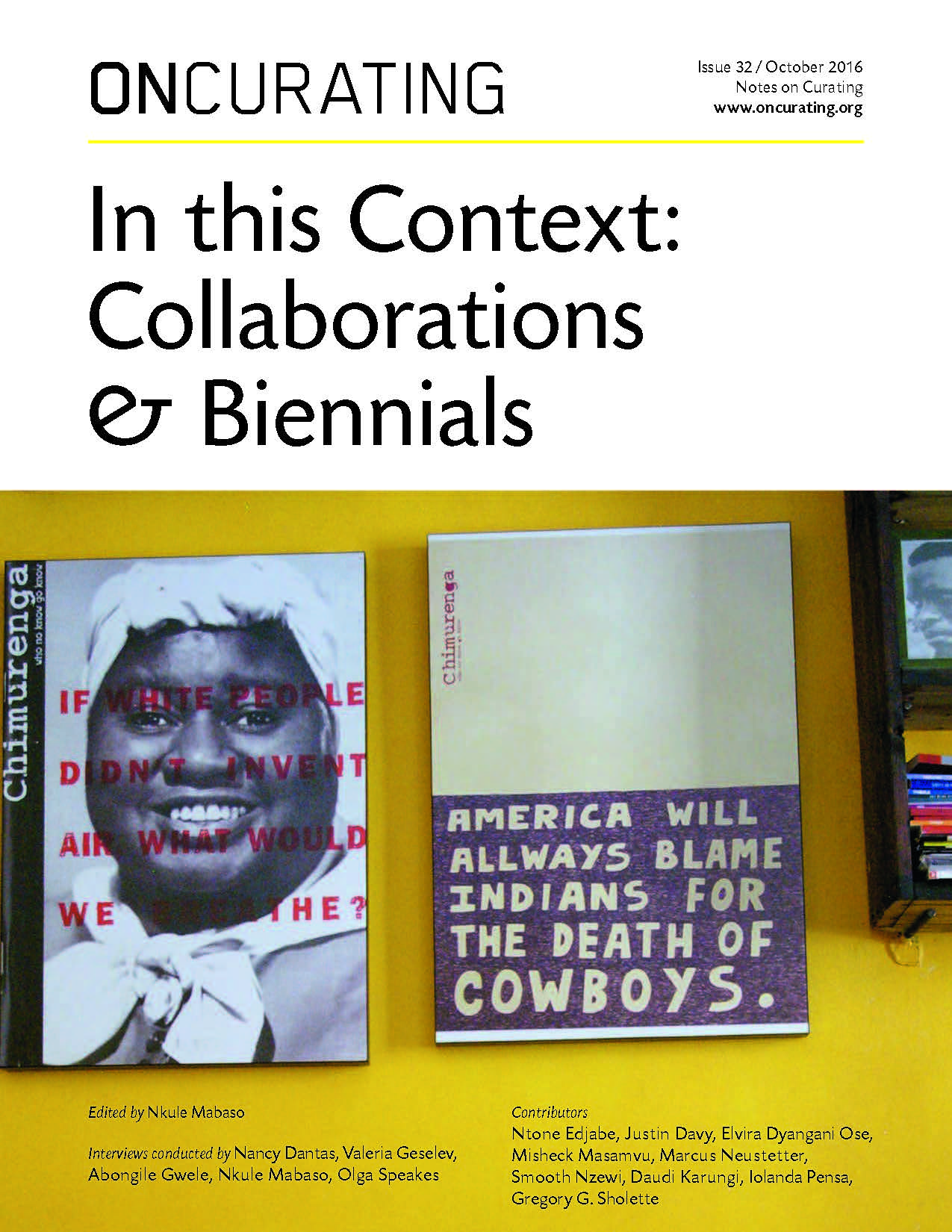 In this Context: Collaborations & Biennials is an issue edited by Nkule Mabaso in which collaborative work is of a special interest because it raises complexities questions on the fundaments of curating and artistic work through questioning the exhibitionary complexes. These concerns extend through to the biennale form where the thematic and their aesthetics move from formalist, object-bound sensibility to practices based on experimentation and agitation, processes, ephemerality, political and social ideas that are locally embedded. The practices represented in this issue are not collectives and collaborations in the traditional sense, but practices that follow more self-instituting strategies grounded in their immediate socio-political contexts. This issue of OnCurating consists of two parts: the first part researches collaborative work with an emphasis on African collectives, and the second part offers an insight into the development of biennials on the African continent.