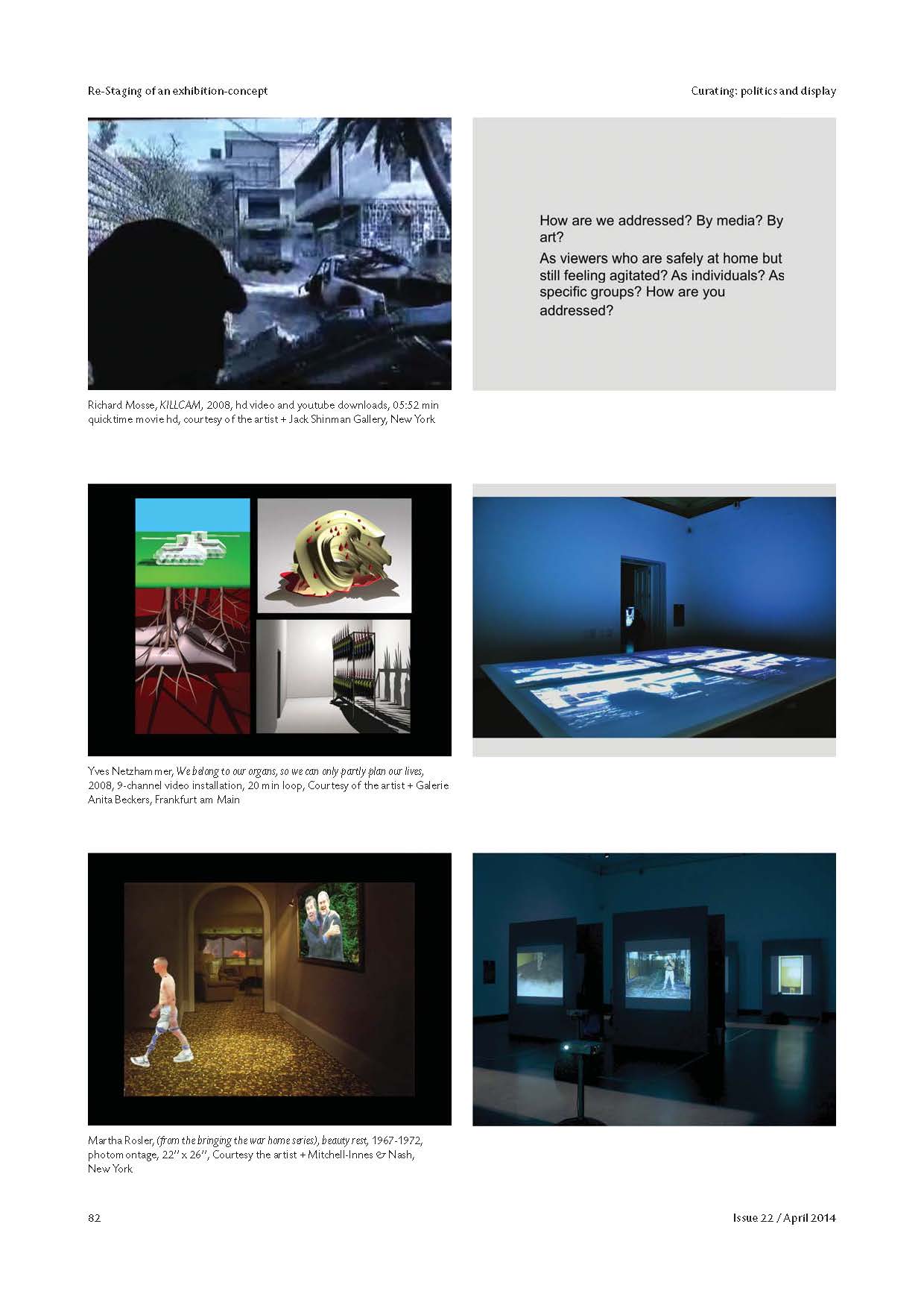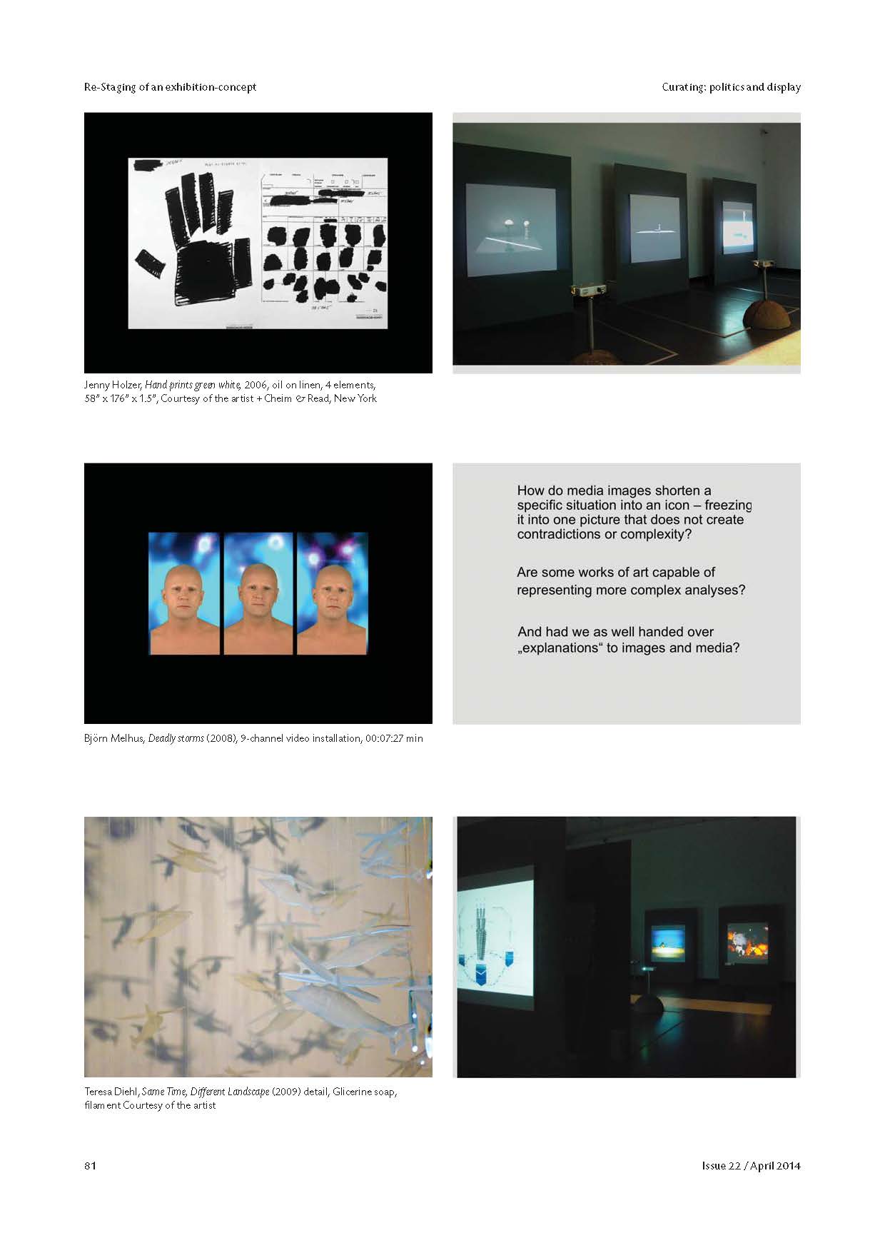 In the spirit of slowing down, in sometimes rather a hastily discourse, we would like to present them to a broad public, which engages with our main topics: politics of display, politics of site and politics of transfer and translation, topics which refer clearly to the research institution where the Postgraduate Programme in Curating is situated: the Institute Cultural Studies in the Arts at the Zurich University of the Arts. We see the curatorial discourse not primarily as a philosophical discourse with some practical outcomes. We are always interested in the power relations and politics, which structure the field. As curators and as researchers we have chosen the attitude that practice and theory are intertwined profoundly, and both materialisations have the ability “to do things” with art and with words, to intervene, to highlight.
